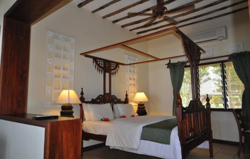 Rooms at Kilifi Bay feature tiled flooring and four-poster beds draped with mosquito nets. Each room includes a private bathroom stocked with complimentary toiletries and a hairdryer, as well as a fridge and tea/coffee-making facilities for convenience.